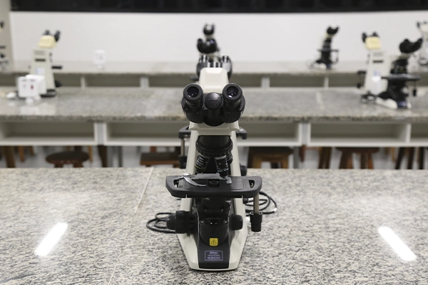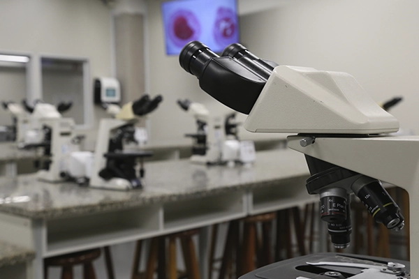 Equipado com microscópios e materiais especializados, o laboratório possibilita a observação detalhada de estruturas celulares e teciduais, reforçando a base científica necessária às áreas da saúde.